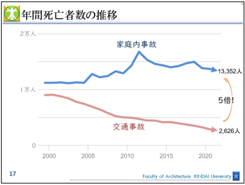 国土交通省の2018年の推定によると、日本の既存住宅の約7割は無断熱または低断熱(断熱等級3以下)の状態にあり、多くの人が「江戸時代と変わらない寒さ」の中で生活しているのが現状です。その影響は命にまで及んでいます。交通事故による死者数は年々減少していますが、家庭内での事故による死者数はその5倍以上にのぼるのです。