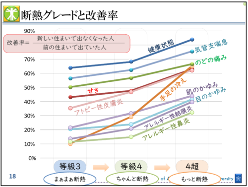 住まいの気密・断熱性能を高めると、ヒートショックリスクを低減できるだけでなく、アレルギーや喘息等の症状や発生リスクが緩和されることがわかっています。下図は、岩前篤教授が、新築住宅に引っ越した2万人以上の方々を対象に、転居後の住宅の断熱グレードと住まいの健康影響に関してアンケート調査した結果です。
