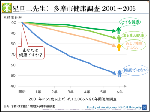 東京都多摩市では、2001年から6年間にわたり、65歳以上の市民およそ1万3千人を対象とした大規模調査が行われました。調査の冒頭で、「あなたは健康ですか?」というシンプルな質問がされ、その回答に応じてグループ分けが行われました。その後、6年間の生存率を追跡したところ、「とても健康だ」と答えた人の6年後の生存率は約90%。一方で、「健康ではない」と答えた人は約50%にまで下がりました。