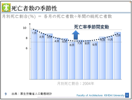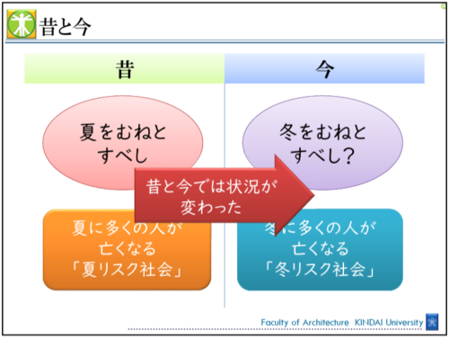 なぜ冬のリスクは長い間見過ごされてきたのでしょうか。かつての「家の作りやうは、夏をむねとすべし」という指針は、夏に多くの人が命を落としていた時代には合理的でした。しかし現代では、死亡リスクは明確に冬に集中しています。