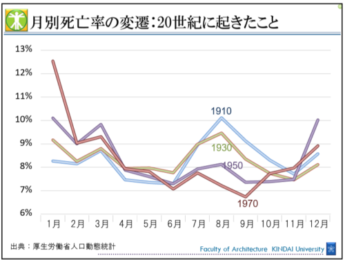 日本の月別死亡率の推移を見ると、1910年頃は8月に死亡率が最も高く、「夏リスク社会」と言える状況でした。しかし時代が進むにつれて、夏の死亡率は着実に低下。1970年には状況が逆転し、それ以降50年以上にわたり、冬に死亡率のピークが訪れる「冬リスク社会」が定着しています。